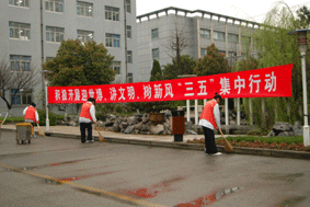 学校在校园网上发出了开展“三五集中行动”的通知书。各教学部利用班会课时间在07、08级学生中开展了世博知识培训和“三五集中行动”宣传,对于已到校外实习的06级毕业班学生,则利用返校汇报实习情况的时机开展了培训,做到了学生培训全覆盖。校党总支组织党员干部参加义务劳动,清除校园卫生死角的垃圾,拔除草坪杂草。学生处和团委组织学生开展了全校性的卫生大扫除工作。对校门周边