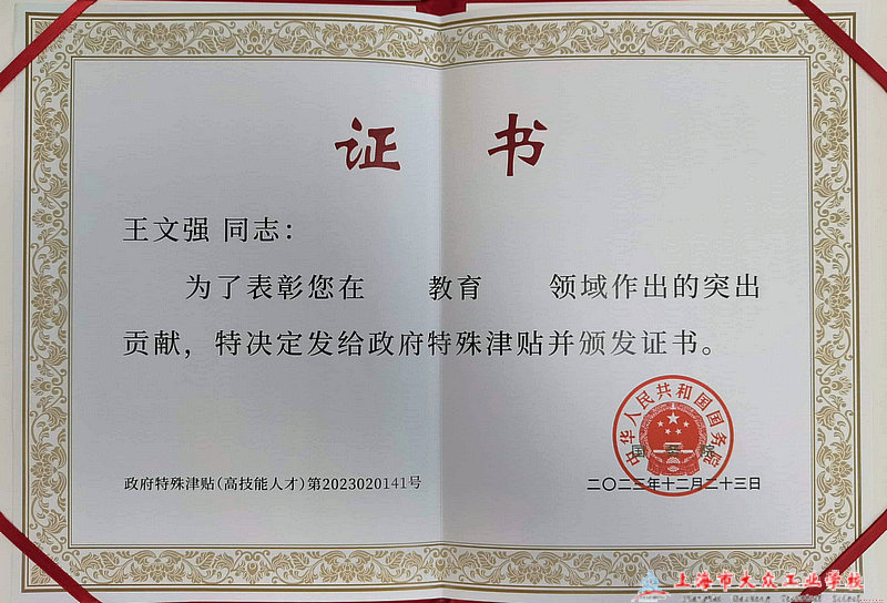 为表彰先进、树立榜样,近日,嘉定区人力资源和社会保障局副局长丁佳为上海市大众工业学校教师王文强颁发“政府特殊津贴”证书,这不仅是对王文强老师深耕职业教育取得成就的充分认可,也是对学校在培育高技能人才征途上不懈努力的高度肯定。