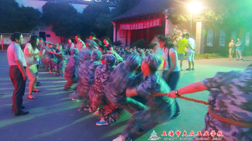 9月2日晚上6:00,经历了白天的艰苦的训练,同学们迎来了振奋人心的拔河比赛。浏河营地广场上军歌嘹亮,12个班级组成的方阵整齐的排列在操场上,准备迎战军训拔河比赛。比赛采用的是淘汰制,各班教官抽签完毕。在距拔河比赛开始的一段时间,各班的教官细心地指导着同学们的拔河动作,讲解着其中的注意事项,同学们瞪大眼睛,仔细聆听教官的每句话,每个同学们的脸上都写满了自信,还不时的鼓励自己同伴。各班的啦啦队员也准备就绪了,加油声此起彼伏,震耳欲聋,他们已经吹响了比赛的集结号。