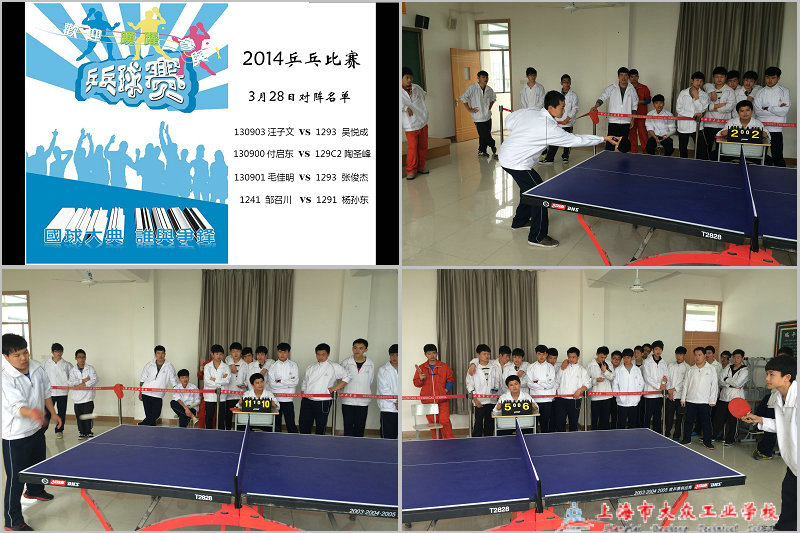 2014年3月,在陆浩勤副校长、徐军主任和数控部潘品方、孙琪两位主任的多方协调下,经过了一周时间的筹备,器材、地点、规则、方案都准备就绪,3月24日,名为“国球大典,谁与争锋”的数控办学部第一届乒乓球比赛,正式在3教402教室拉开了帷幕。