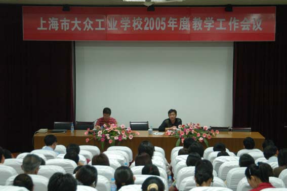 2005年6月8日下午2点半,上海市大众工业学校在阶梯教室召开2005年度教学工作会议,全体中层干部、教研组长、年级组长、班主任,全体督学共110余人参加了会议。俞勇彪副局长到会作了重要讲话,他明确指出要根据职业教育与市场紧密相连的特点、要探索教育与市场相适应的机制、要建立以人为本的培养模式、构建终生学习的体系、培养学生的创业精神,要全面推进学分制工作,从而为我校今后的发展指明了方向。大会听取了普陀区教育局德研室主任陈镇虎老师关于如何当好班主任的专题报告,校长谭燮昌同志和校有关部门负责人就学生管理、就业推荐、学分制教学等作了专题发言。最后由校党总支书记徐福生作了总结讲话,提出了对职业教育要有新认识、新思路、新举措。整个会议准备充分、安排紧凑、内容精彩、充分体现了精简、省时、高效的原则,达到了学习、交流、团结、奋进的目的。
