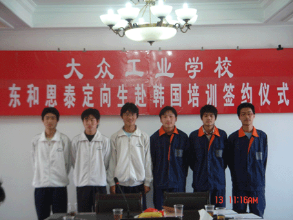 2007年4月13日,世界顶级热交换器制造商、韩国知名企业——东和恩泰与我校07年毕业的张林、阮昕章、朱梦杰、徐伟、蒋俊、周廷文6名“星光”选手签订了正式用工协议。作为上海工厂的技术骨干,公司将于本月底送6名同学赴韩国参加为期6个月的岗位培训。