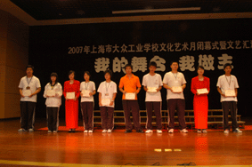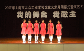 5月31日下午,在大众工业学校多媒体教学中心里,全校各教学部选派的近1000名学生代表席地而坐,济济一堂、人声鼎沸,这里成了欢乐的海洋,“我的舞台 我作主”2007上海市大众工业学校文化艺术月闭幕式暨文艺汇演在这里隆重举行。在文艺汇演前,陆浩勤副校长表彰了2006年度市、区、校级“三好”学生、先进班级集体,并颁了奖。高康校长作了热情洋溢的讲话。在随后的文艺汇演中,同学们载歌载舞,用优美的歌声、曼妙的舞姿表达着青春的激情,台下同学们热烈的掌声掀起了一个又一个高潮,老师们的友情演出更是为文艺汇演锦上添花。最后,校文学社的诗歌朗诵《青春中国》,豪迈而雄壮,使整个会场激荡着爱国的情怀,至此,为期一个月的文化艺术月缓缓落下帷幕。