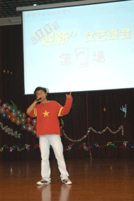 值此辞旧迎新之际,利用晚自修的时间,以参加校第二届学生才艺比赛的同学为主,校团委组织了三场迎新文艺晚会,观众主要是全校1000多名住宿生。三场迎新晚会不仅是学生特长展示的舞台,也是学生锻炼活动组织能力的平台。节目的组织策划、演出全过程的监督,工作人员的分工安排等都由学生来在组织落实。三场演出,一场比一场成熟,一场比一场精彩,在演出中也有很多台上台下的互动,在学生主持人的鼓动下,哪怕是没有伴奏带,台下的同学们也都能踊跃的上台来哼几句,唱几段。走调了,破音了,这些都无所谓,最主要的是他们的勇气使台下的观众为之鼓掌喝彩。