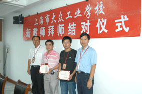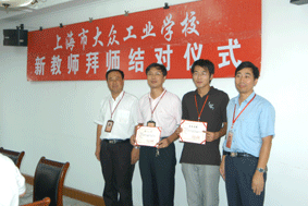高明副校长首先宣布了在07-08学年拜师结对活动中表现突出的优秀师徒对子,田凤霞与杜文强,孙红专与方静超两对师徒获此荣誉。四位老师都谈了师徒结对一年多年的感受。田凤霞与杜文强老师不是相同专业的艺教老师,但他们在完成共同的任务中结下了深厚的友谊。田老师在配合协调方面做了许多工作。而杜文强老师一年来在田老师的指导下不断完善和进步,为学校获得嘉定区民族教育陶艺特色基地和上海市艺术教育特色学校称号做出了贡献。孙红专是数控实训教学的“老法师”,方静超是毕业留校的新教师。在孙老师言传身教下,方静超进步迅速,在学校首届教师教学技艺展示活动中获得了一等奖,而孙老师也在带徒的过程中不断完善、提高了自己的教学艺术和教学水平。四位教师的发言情真意切,感人至深。在热烈的掌声中,高康校长向他们颁发了荣誉证书。