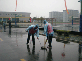 3月21日早晨5:30,负责校门口接待的志愿者到位,6:30分,负责接待任务的所有志愿者到位,8:00,担任主会场观众和举牌任务的所有志愿者全部到位。为了能够准时到岗,那些平时乘坐校车或公共汽车上学的同学们克服了各种困难,由于早班车太晚,个别同学甚至乘坐出租车及时赶到学校。就在志愿者们各就各位,开始紧张而又忙碌的工作时,老天爷给大家开了个玩笑,下起了时断时续的雨,也夹带着丝丝寒意。这似乎是老天爷在考验志愿者。在大雨中一幕幕动人场景这样上演着:由于在毫无征兆的情况下下起了雨,那些身穿红马甲的志愿者在为兄弟学校参赛选手运送比赛用具的路上,没有因为大雨的降临而选择扔下小推车去躲雨;有的志愿者忙于搬运比赛工具,忙于打扫卫生,顾不得把雨衣的帽子戴戴好,头发被淋湿了,也只是在老师的提醒下,憨厚的说没关系;在大风大雨中,那些站在各个拐角的志愿者尽管身穿一次性雨披,但还是被淋透了,然而,他们依然屹然不动地站在那里;在接待客人的贵宾室里,身穿旗袍的女孩们被冻坏了,但她们还是坚持把最美丽的笑容展示给来宾。在开幕式的主会场里,从9:50分,志愿者进场开始,到开幕式结束的整整一个多小时的过程中,同学们一直是那么挺直的站在那里。说实在的,之前,带队老师有那么一点点担心,担心同学们会坚持不了这么长,会有交头接耳,会有左顾右盼,然而我们看到的确是同学们至始至终笔直的身影,尽管,还有那么一点点的遗憾,有几位同学因为体力不支而晕倒,但是他们也令在场的老师敬佩,因为他们也一直坚持着,直至实在不行,倒下的那一刻。开幕式结束,在领导退场后,同学们也没有一哄而散,在老师的指挥下,依旧是整齐地举着牌子,排着整齐的队伍退到体育馆,一路上引来了不少来宾和媒体注视的目光。下午,竞赛组的志愿者以及接待组的部分志愿者仍旧坚守着自己的岗位,配合老师做好相关工作。