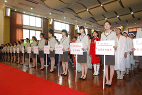 本学期一开学,“星光计划”技能赛开幕式的各项筹备工作就有条不紊的开展起来。学校团委在接到招募、训练技能赛志愿者的任务后,向全体学生发出了志愿者的招募通知,随即得到了同学们的热烈响应。在200名递交报名表的学生中经过面试录用了150名志愿者,主要担任开幕式的接待工作。同时,根据岗位的特殊要求,在文科教学部、数控教学部中选取了220同学担任开幕式主会场观众任务和举牌任务。因此,在本次开幕式中,共有370名左右的学生志愿者服务在大赛的各个岗位。