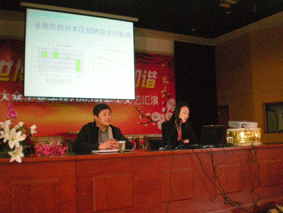 “金融风暴”使我区招聘岗位需求下降了12.85%,诸静洁老师向在座师生们从全球金融危机,谈到区域经济,一张张PPT的内容展示的是历年来我区对三校生的需求调查及岗位分布情况,这种图文并茂的讲座形式及清晰的数据,使同学们直观的认清当下的就业形式。