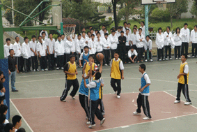 2009年10月12日中午12:25分,以“迎世博、促和谐”为契机,上海市大众工业学校09级篮球比赛正式鸣哨开赛。经过校团委的精心策划与组织,以及各教学部班主任的高度重视,第一天比赛准时、正常、有序。