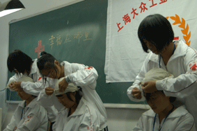 活动包含了由辅导老师讲解的有关红十字会的理论知识、08级学生带领进行的宣誓和包扎实地训练三部分。活动中,同学们积极发言,踊跃参与,包扎过程中互动良好,在09幼保班同学的指导帮助下,学习了受伤时的基本应急措施,两人一组进行了操练,并取得良好效果,同学们对这次活动深感受益非浅。