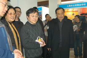 开展第一天,上海市教委副主任印杰、在市教委职成教处王向群处长的陪同下,来到我校展位前,仔细地观看了我校的校本教材,并听取了高康校长的汇报,对大众工业学校结合企业需求、根据专业发展编写校本教材所取得的成绩表示赞赏。