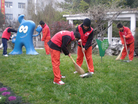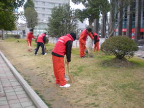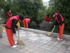 接到学校所在社区《“奔向世博 冲刺100”迎世博倒计时100天活动》的通知后,同学纷纷踊跃报名参加志愿者活动, 21日早晨8点半同学穿好志愿者红马甲、带着扫把和垃圾车,集中在校门口,等老师告知清扫、清运要求以后开始行动。虽然天有些阴沉和寒冷,但学生们在老师带领下拿出了十二分的精神对学校门前的环城路进行清扫。在一个多小时的清扫活动中,同学们捡起了马路上的果皮、纸屑、烟蒂;把商家随意丢弃的垃圾扔进了垃圾桶;对随意停放的自行车微笑着进行劝说。同学们一丝不苟地做着每一件事情。红色的身影格外的引人注目,路上的行人纷纷投来了赞许的目光。