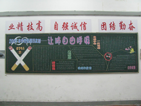 根据学校各个阶段工作重点,学校团委每月为每个教学部确定一个主题,以国家大事如迎奥运、迎世博、国庆60周年等为主题;以纪念日节假日如学雷锋、五四青年节、庆祝元旦、劳动节等为主题;以安全教育如119消防日、交通安全、校园安全、饮食安全等为主题;以学校主题教育活动如迎世博文明礼仪、仪容仪表规范专项教育等活动为主题;以预防疾病如预防艾滋病、毒品教育等为主题,还有以环境教育、法制教育等等为主题。从这些灵活多样、紧跟学校德育步伐的主题出发精选的素材,以黑板报的形式让班级里的这堵墙成为了学生的精神乐园,使班级更富有凝聚力。
