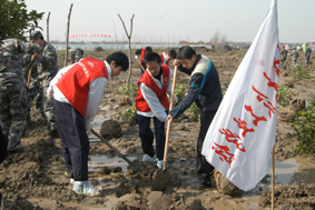 又是阳春三月,大众工业学校团委再一次组织团员青年参加菊园新区的植树活动。3月16日上午,在团干部李君老师的带领下,师生一行7人来到了位于嘉安公路旁的六里新家园。植树现场,彩旗飘飘,一棵棵树苗整齐的躺在地上。在现场工作人员的指挥和安排下,老师和同学们迅速组成了合作小组,动作熟练的开始植树,有的拿起铁锹在指定的地点挖起了坑,有的负责搬运树苗,放到挖好的坑里,有的负责填坑,一切都进行的有条不紊。在大家的努力下,20多支树苗一棵棵站立起来,在微风中点头致意。