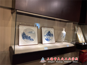 雨过天青云处开,白釉青花一火成。当我亲眼看到从我手上诞生的青花一朵朵绽开在瓷盘里,躺在展柜中,又忆起创作过程中无数次的修改,颇有一日尽看长安花春风得意马蹄疾的快感。放眼整个展厅,同学的讨论宛如景得镇的焰火,细细观赏老师的作品,才发现平日毫不夸耀展示的他竟藏了这样一手高超的技艺。他所绘制的青花瓷板让人一眼就感悟到了陶渊明笔下“采菊东篱下,悠然见南山”的恬静感。