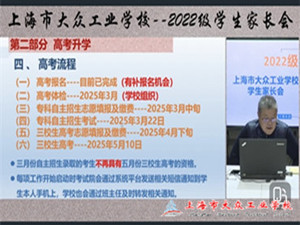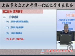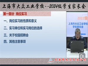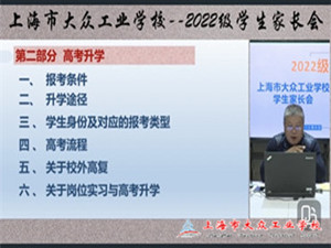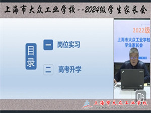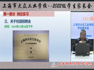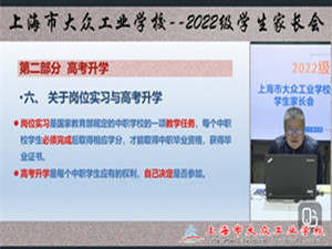 12月8日上午9:30,上海市大众工业学校在钉钉平台召开了2022级毕业班学生家长会,通过线上直播的形式,与家长们就学生的岗位实习和高考升学等重要事项进行了深入交流。会议由市场部主任朱强主持,2022级学生家长和相关班主任参加会议。
