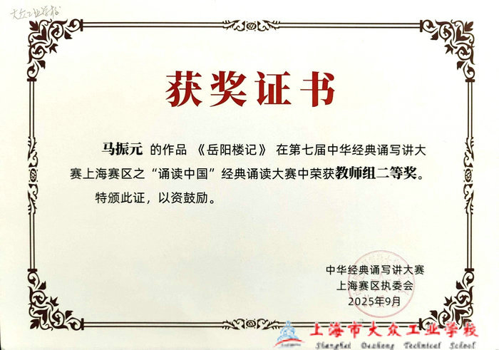 近日,上海市大众工业学校教师马振元凭借深厚的语言艺术功底与真挚的情感表达,在两大朗诵赛事中连创佳绩——作品《岳阳楼记》从全国1127件作品中脱颖而出,摘得第七届中华经典诵写讲大赛“诵读中国”教师组全国三等奖,此前更已将上海市二等奖、嘉定区一等奖收入囊中;原创作品《献给改革开放的总设计师邓小平》在“颂歌献党庆华诞 砥砺奋进新征程”上海市中等职业学校第四届青年教师朗读活动中与281位选手的激烈角逐,最终斩获一等奖。