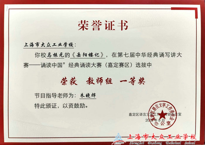 学校教师斩获多个奖项,充分彰显了学校传承经典、扎根红色文化的扎实成效。上海市大众工业学校持续深化文化育人内涵建设,引导师生在诵读经典、感悟红色历史中厚植家国情怀、增强文化自信、汲取奋进力量。未来,学校将继续以文化建设为抓手,持续完善育人体系、创新育人载体、强化育人实效,不断提升办学质量与内涵发展水平,为培养德智体美劳全面发展的社会主义建设者和接班人、助力教育强国与文化强国建设作出更大贡献。
