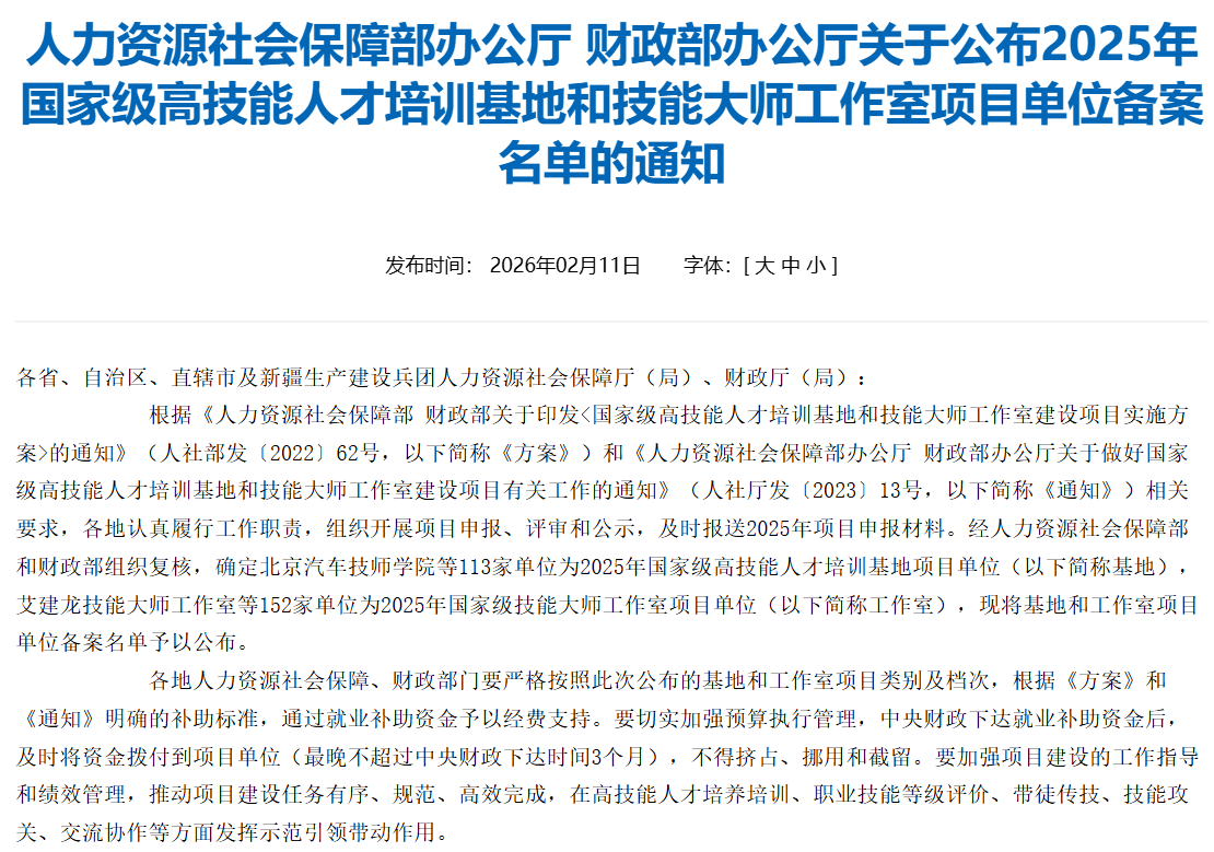 近日,人力资源社会保障部办公厅、财政部办公厅联合发布《关于公布2025年国家级高技能人才培训基地和技能大师工作室项目单位备案名单的通知》,上海市大众工业学校申报的“王文强技能大师工作室”成功入选2025年国家级技能大师工作室项目单位名单,项目类别为生产制造类,这是学校在高技能人才培养领域取得的又一重要突破。