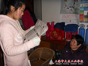 3月4日星期日,下午2点。11级幼保班的四位同学,迎着微凉的细雨,来到了新成路街道敬老院。她们将新鲜的水果带到了203房间,探望了那里的四位老人。同学们热情的问候与爽朗的笑声,让老人倍感温暖。进入卧室,女生们亲手为老人洗了带来的小番茄,剥开了香蕉。把桌边的报纸拿来,给老人们朗读了时政新闻。虽然只是为她们做了一些小事,但在聊天的过程中,还是能感觉到老人流露出的幸福感。