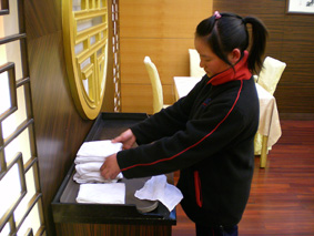 在服务的三天里,同学们从不迟到早退,也不请假。在服务过程中,她们很用心地去做每件事,碰到不懂不会的,她们也主动地去问。会场中的学生端茶倒水、擦杯洗盖,样样做的有模有样,餐厅里的学生收拾碗筷、扑台搬椅,也都不厌其烦,每个人在自己的岗位上尽心尽责,很好地完成了学校交予的任务,得到了一次很好的锻炼。