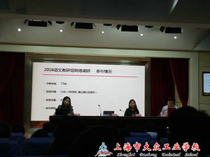 活动第三个环节是由上海市教委教研室的应宏芳老师为大家汇报了2016年中职学校语文教研组实地调研的相关情况,包括学校的参与情况、各学校的教学安排等等,同时应老师也布置了2017年语文教研组实地调研的相关内容及时间安排,希望各校语文组能用心准备,认真对待。