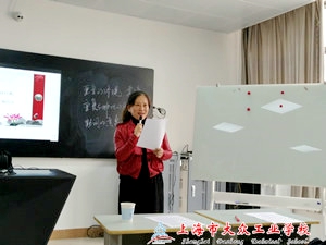 11月15日中午,上海市大众工业学校组织的校园文化建设项目诵诗班培训活动继续上课,参加此次诗歌朗诵培训活动的有杨建英、沈琳、周晓健、杜天一、彭茂清等不同系部的老师。活动依然邀请的是上海大学声音培训师吴笑老师来为大家做指导。此次朗诵培训的篇目是余光中的爱情诗《祈祷》,吴老师首先为大家示范朗读,并板书该诗的朗诵要求,之后聆听了老师们的朗读,针对老师们在朗读中出现的问题再进行点评指导。本诗深情低缓,老师们在用心朗读的过程中得到了情感的升华。