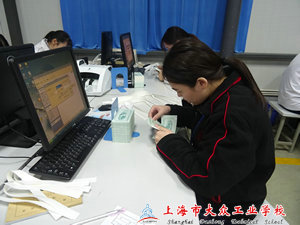 上午9点半,比赛在会计实训室中准时开始。第一个项目为传票翻打。传票翻打采用爱丁数码公司翰林提专用输入设备,比赛时间为15分钟,当专业老师一声令下,整个赛场只听到学生们手指快速敲击键盘的声音,每个学生都全神贯注,积极应战。第二场点钞比赛为手持式单指单张,采用散把形式,选手持钞采用手持式或手按式均可,限时不限量,要求选手在5分钟内完成点数、扎把等工序,计算实点钞券张数,张数越多,分值越高。比赛一开始,同学们立马埋下头,专注地开始点钞,有的同学手指灵敏反应快,不到五分钟已累积了好几沓钞票,也有的同学操作不够娴熟,手因紧张而颤抖,时间一到,成绩出来了,真是几家欢喜几家愁,成绩好的同学有信心继续埋头苦干,成绩差的同学难免失落,但依然想争取在接下来的比赛中再接再厉。比赛结束后老师们将综合所有成绩来排出最终的竞赛名次。