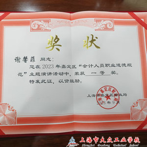 7月份,会计专业学生参加了会计知识百题知识竞赛。2023年9月15日,220201班学生谢馨菲参加了嘉定财政局举办的《会计人员职业道德规范》青年演讲选拔赛,喜获一等奖,她将代表嘉定参加由市财政局举办的青年演讲比赛。本次演讲稿和演讲PPT由谢馨菲同学亲自准备。为了能把这5分钟的演讲准备好,她认真书写了关于《筑牢诚信理念,推进诚信建设》的演讲文稿,随后一次又一次修改,从篇章结构的安排到典型材料的选用,从字斟句酌的遣词造句再到文从字顺的流畅表达,每一处都做到精准表达,确保在有限的时间里演讲的内容有说服力,能感染听众,达到共情性。记得9月3日下午,大雨如注,她却早早地来到学校,和会计专业老师探讨演讲稿内容的修改,向语文老师请教演讲的技巧,她身上的执着精神多么可贵!