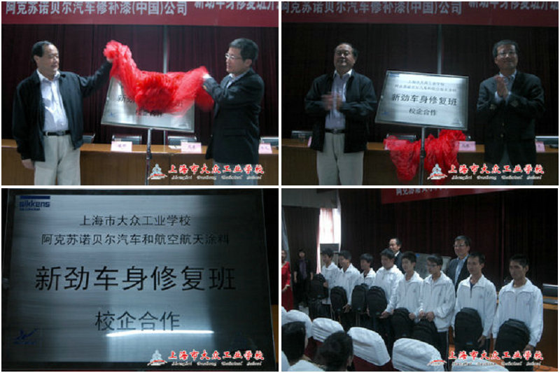 2011年10月25日下午2点整,在上海市大众工业学校四号教学楼的阶梯教室中,举行了一场简短而又隆重的阿克苏诺贝尔汽车修补漆(中国)公司与我校合作办学的新劲车身修复班开班典礼。出席本次典礼的校领导有高康校长、党总支书记梁桦老师以及汽修教学部主任邱伟明老师,阿克苏诺贝尔汽车修补漆(中国)公司的出席代表有公司的巫伟光总经理和杨钧经理。