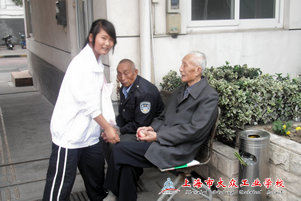 和前几次一样,接待志愿者们的是福利院的徐主任,接下来服务小队的成员们两两分散开来,为不同寝室的老人们送上水果和点心。服务小队的刘清华和王婷两位同学注意到有一部分老人们喜欢坐在楼道外的椅子上晒晒太阳,于是她们在为寝室的老人们派发完水果之后又来到楼道为那里的老人送爱心。这个过程里,刘清华同学正巧看见一位年纪很大的老爷爷要下楼梯,她急忙上千搀扶他,老爷爷客气地对她说了声“谢谢”。