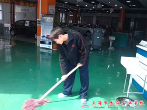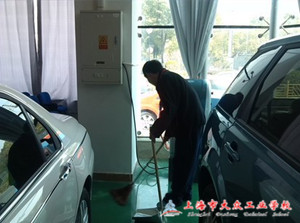 2013年3月8日午餐过后,汽修部志愿者服务小队的9名成员在队长曹佳雯同学的带领下集合在嘉定汽车销售公司的大厅内,将要为嘉定汽车销售公司打扫卫生。公司陈老板热情地迎接他们的到来,并邀请公司清洁工人帮助配合队长向各名队员分配任务。