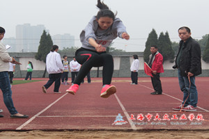 上午九点三十左右开始了女子跳高比赛。首先上场的是肖舒琪同学,工程系的同学们加油声此起彼伏,场面甚是壮观。在阳光的照耀下, 跳高的比赛场地格外辉煌。看她离弦箭似的助跑,蚂蚱似的起跳,空中的走步表演,引起在场的同学们阵阵惊叹,落地的瞬间,当她触到了海绵垫的一刻,她的女子跳高成绩定在1.15米的高度,夺得冠军。