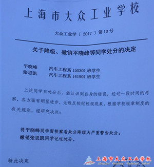 在5月份的系部评优活动中,我系141901班张思凯同学,150301班平晓峰同学因积分排名前两位,经班主任、任课老师、系主任及学生处认真仔细研究后给予降级处分决定。这一决定不仅维护学生的权利,还极大地鼓舞其他受处分学生。