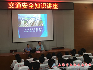 在培训讲座开展前黄队长首先播放了一段交通安全宣教短片,该短片以卡通动画的形式,向学生宣传教育了交通安全知识与常识。黄队长首先以一连串的问题拉开了培训的序幕,结合宣教视频的内容,黄队长以生动的语言、直观的表述,向在座学生们讲解了《上海市道路交通管理条例》。