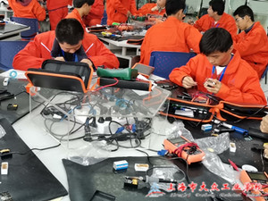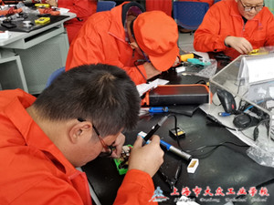 实训指导老师将同学们分成了5个六人小组。实训过程主要是集中时间学习专业课、巩固专业知识的过程。专业老师将枯燥晦涩的知识深入浅出、形象幽默地讲述出来,同学们按照老师的要求认真练习,整个过程中,同学们有疑问会共同探讨,也会主动向实训老师请教,在练习焊接的过程中,大家互相学习,共同进步,将理论学习与动手操作相结合,将老师的讲解指导与同学间讨论合作相结合,进一步开阔了视野,增长了知识。比如,在焊接中,同学们针对如何焊接时如何避免虚焊和假焊这个问题,反复思考,不断探索。慢慢调整电烙铁的温度,控制焊锡丝的进量,经过多次尝试,做到焊后,每个元件纹丝不动,扎实稳固,按时并高质量的完成焊接任务。整个实训室弥漫着严肃认真的学习氛围。最终看着自己完成的收音机作品,大家心中的成就感和自豪感油然而生。