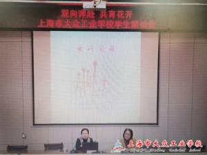 然后,沈菊芳副校长介绍了大众工业学校的办学理念。她指出,我校是一所以工科类专业为主的全日制国家级重点中等专业学校,具有学历教育、职业技能培训、职业技能鉴定三大功能。作为上海市特色示范校,我们学校一直是半军事化管理,通过示范校和办学特色展示教学实力和教学效果。学校有好的平台展示学生自己,以及科技沙龙和职业技能大赛实现学生的梦想。同时,她还表示,孩子的成长离不开家长的支持与配合,要家校联合,为孩子美好的未来而共同努力。
