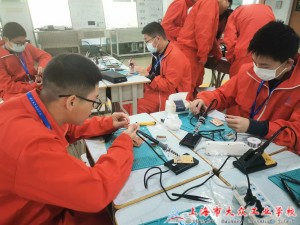 学生们穿上电工鞋,拎着电工工具箱,对实训室里的装置充满着极大的好奇,一会动动这,一会碰碰那。负责老师通过讲解,指导学生制作不同的电子模型,在制作中了解如何合理使用电,家里电器出现故障需要如何解决等。通过老师的细心讲解,大家明白了电工工具分为通用工具和线路工具两种,通用工具有验电器、钢丝钳、螺钉旋具、电工刀等。通过老师的讲授同学们还了解到电工常用材料又分为导体材料,磁性材料和绝缘材料,导线的连接有多种连接方式。