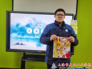 扎染的艺术历史悠久,是中国民间传统而独特的染色工艺,同时也是国家级非物质文化遗产。活动中,老师首先对同学们进行了扎染理论知识的介绍,从多个方面对扎染这门民间艺术进行了解,也知道了扎染艺术在现代社会中的一些应用。重点讲述了扎染工艺这一方面,为接下来亲自动手制作扎染作品做了充分的准备。然后老师带领大家一步一步调色、软化、造型、浸染、冲洗、晾晒。学生们兴致高昂,发挥自己的想象力,通过一些简单的辅助工具,根据老师所讲解的步骤在帆布包上缠绕、折叠、捆扎等不同手法,大胆塑造自己喜欢的造型,积极尝试,最后都完成了自己的“艺术品”。