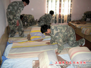 入营第一天,教官走进学生寝室,手把手教导,面对面示范,向同学们讲解了折叠的要领,数控教学部的