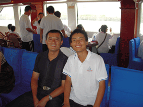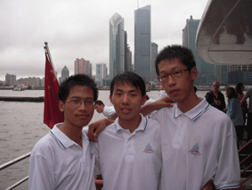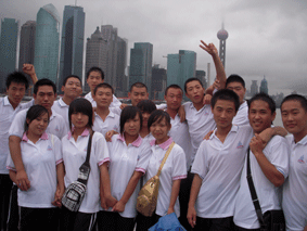很快我们来到了目的地。首先参观的是浦江两岸的景色,听我们的导游说,这个是上海典型的景观之一。随着游轮的前进,我们看到了上海市的标志性建筑——东方明珠电视塔,可惜由于下着蒙蒙细雨,高楼靠近上面的一部分都在云雾里面,好象是有一层白纱。金茂大厦也是隐隐约约,看不清楚,但是这又是别一番情趣。我们的同学此时也争相拍照留念。
