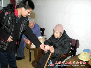 看到志愿者们的到来,老人的脸上露出了开心的笑容,像是见到了旧别的亲人。在敬老院工作人员的指导下,志愿者们分批进入各个公寓楼,以真诚、热情、开朗的情怀为老人们送上温暖。瞧,同学们为老人们冲泡豆奶、拨香蕉,细心“喂”老人们服务。其中一位同学,为年近90岁的老人读报;有两位同学,为老人们做起了按摩;还有一位志愿者为躺在床上熟睡的老者盖好被子,防止老人受凉,他的这一举动得到了在场工作人员和老人们的一致好评。