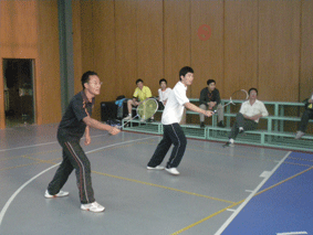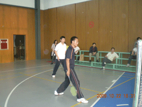2009年10月22日下午4点20分,上海市大众工业学校羽毛球比赛16进8强的争夺赛依旧火爆。这两场双打比赛均由数控部教师对阵各自强劲对手。由于本轮比赛有夺冠大热门朱文、陈琼毅老师组合首次亮相正式比赛,对阵数控部两位年轻的方静超和李东东老师,引来了许多爱好羽毛球的老师们与学生们驻足观看欣赏。尽管在实力方面与两位经验十足的体育老师相比还是有很大的差距,但是数控部的老师们敢打敢拼,对每一个球都去争取不去放弃,用自己的汗水与积极跑动来弥补自己技术上的不足,就算落后5分,10分,甚至15分,方静超与李东东老师还是抹一抹汗,又全身心投入了比赛,这种不轻言放弃的作风,引来了老师与学生们的声声赞许。
