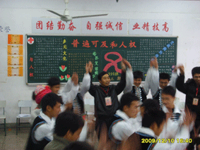 0899班的43位同学分别来自离上海千里之遥的云南省与黑龙江省,并由汉族与彝族的同学们组成的大家庭,在班级的门口,祖国的地图清晰可见。彩色的中国,碧绿的草原,金色的沙漠,蓝蓝的大海,弯弯的江河,960万平方公里的土地上居住着56个民族,情同手足和睦相处才是此次班会课的意义所在。