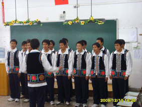 接着是彝族的歌曲选唱《敬酒歌》,铿锵有力的每一个字给予在场的老师与学生们不同寻常的享受与震撼,美丽的彝族少女用水代酒敬给每一位在座的老师们。随后表演的是彝族的《达体舞》,漂亮的俊男少女们穿着民族特色的服装,在班级中翩翩起舞,陆校长
