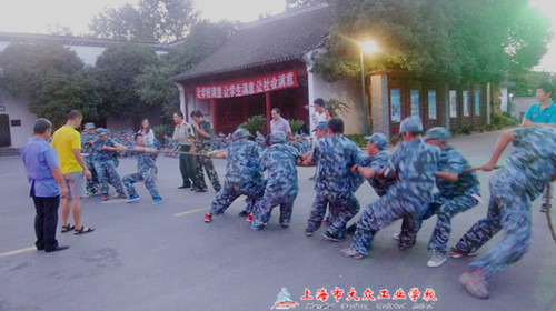 9月2日晚上6:00,经历了白天的艰苦的训练,同学们迎来了振奋人心的拔河比赛。浏河营地广场上军歌嘹亮,12个班级组成的方阵整齐的排列在操场上,准备迎战军训拔河比赛。比赛采用的是淘汰制,各班教官抽签完毕。在距拔河比赛开始的一段时间,各班的教官细心地指导着同学们的拔河动作,讲解着其中的注意事项,同学们瞪大眼睛,仔细聆听教官的每句话,每个同学们的脸上都写满了自信,还不时的鼓励自己同伴。各班的啦啦队员也准备就绪了,加油声此起彼伏,震耳欲聋,他们已经吹响了比赛的集结号。