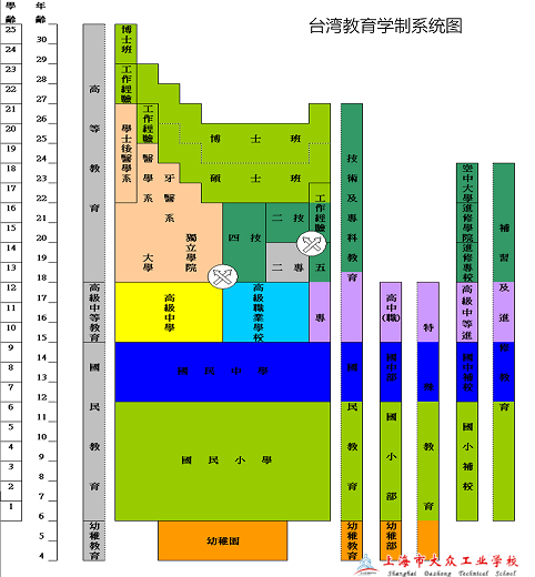 台湾把职业教育称为技职教育,主要包括高职(中等职业教育)、专科教育、本科教育、硕士教育及博士教育五个层次。台湾技职教育体系有如下三个特点: