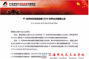 此次F1在学校科技挑战赛世界总决赛的地点位于美国德克萨斯奥斯汀。比赛源于英国已经有近16年的时间,参赛学校队伍甚多,而去年中国第一年也是第一次站在世界的舞台上展现中国学生的风采,今年,我们上海市大众工业学校Forward车队荣幸能代表中国出战,更是代表了上海,代表了上海市大众工业学校,作为全国唯一一所中职校第一次参赛,我们感到无比的激动和自豪。我们将与北京第三十五中学团队齐心协力,团队合作,充分发挥各自优势,能让更多的人了解中国、了解中国的科技创新、了解中国学生;同时更要展现上海风采,展现上海市大众工业学校大众学子的风采;在世界的征程画卷上,代表中国划上一笔浓重而艳丽的笔画……