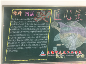 对于不同的人,“工匠精神”有着不同的定义,对于不同行业的人,工匠精神有不同的意义,但归根结底,都是承担起责任,对自己负责、对社会负责。为了让学生零距离接触工匠精神,学习一代大国匠人艰苦卓绝的作风,现代制造系本月黑板报主题以“匠心文化”为主题,相关负责的学生积极利用课余休息的时间查阅资料、翻阅书籍和网络资源,积极的在教室文化上尽心尽力,为班级做贡献。与此同时,作为中职生,一代匠人精神正启发鼓舞着他们不断奋勇向前,苦练技能。