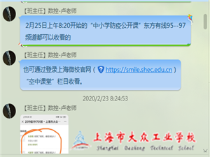 在全体班主任的指导下,同学们顺利找到课程并开始观看,此次中小学防疫公开课内容丰富,呼吁广大的学生要合理地安排时间,做好居家学习的工作;在此时应少出门、不聚会、勤洗手、多通风、多运动,做到劳逸结合;多做眼保健操、保护好眼睛;口罩的使用、暂存方法;妥善保管消毒用品、不建议用酒精消毒液及其他消毒注意事项等等。视频结束后,在班主任和各任课老师的引导下,各班同学在班级群里就视频讲解的内容进行深度讨论,师生互动、温情满满,师生共同讨论、学生二次消化吸收、各位老师的殷殷关切都使得这次公开课的学习达到了较好的效果。